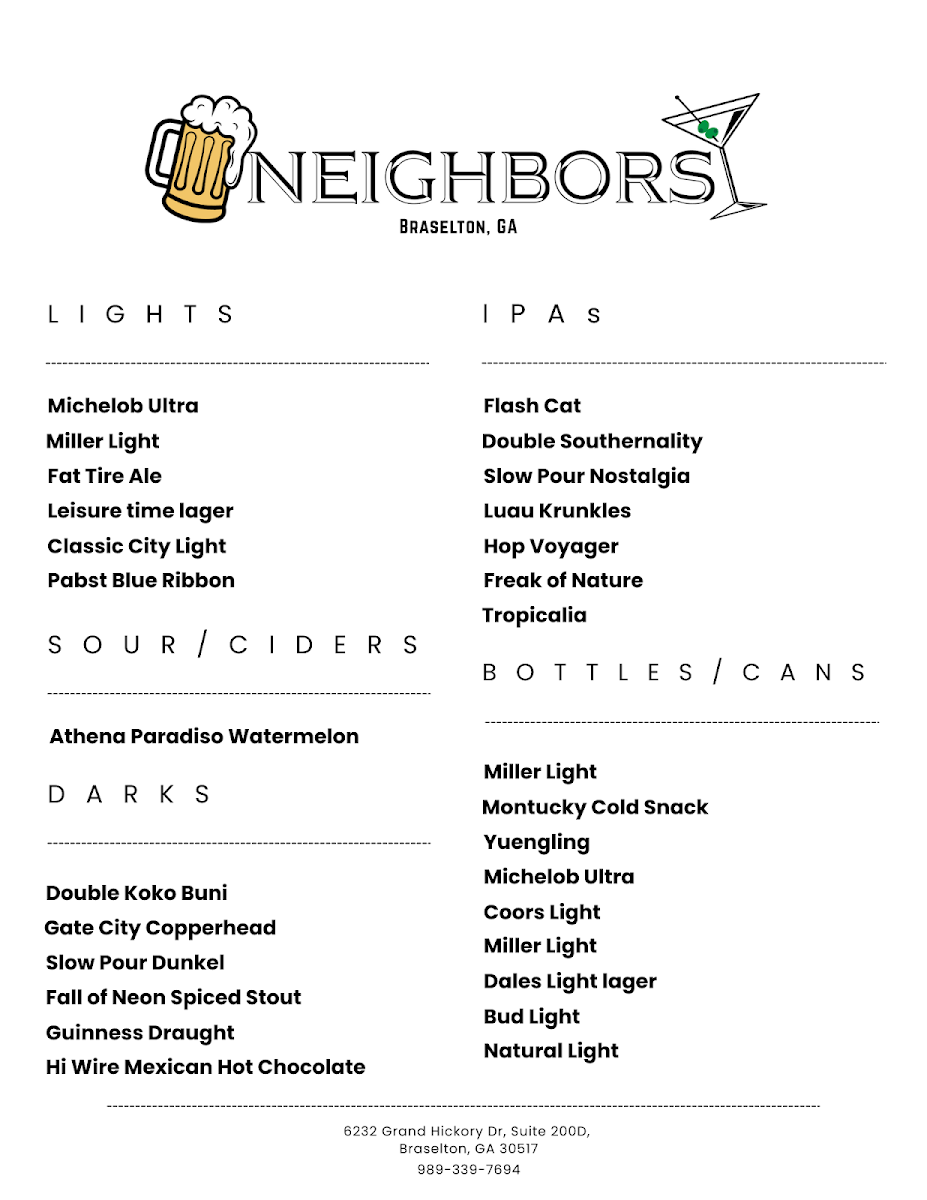 Overall, the drink menu at Hit’s Tap Room delivers a well-rounded selection that caters to a variety of tastes, making it a satisfying stop for beer enthusiasts. The LIGHTS section features easy-drinking favorites like Michelob Ultra, Miller Light, Fat Tire Ale, Leisure Time Lager, Classic City Light, offering familiar and approachable options. For those seeking bolder flavors, the IPAs such as Flash Cat, Double Southernality, Slow Pour Nostalgia, Luau Krunkles, and Hop Voyager provide a diverse range of hoppy profiles. The SOUR / CIDERS category adds a refreshing twist with Athena Paradiso Watermelon, while the DARKS lineup-including Double Koko Buni, Gate City Copperhead, Slow Pour Dunkel, Fall of Neon Spiced Stout, and Guinness Draught-caters to those who prefer richer, deeper brews. Additionally, the BOTTLES / CANS selection, featuring Miller Light, Montucky Cold Snack, Yuengling, Michelob Ultra, and Coors Light, ensures there’s something for everyone looking for a classic choice. While prices aren’t listed, the variety and balance across categories make the menu feel thoughtfully curated and appealing for both casual drinkers and craft beer fans alike.